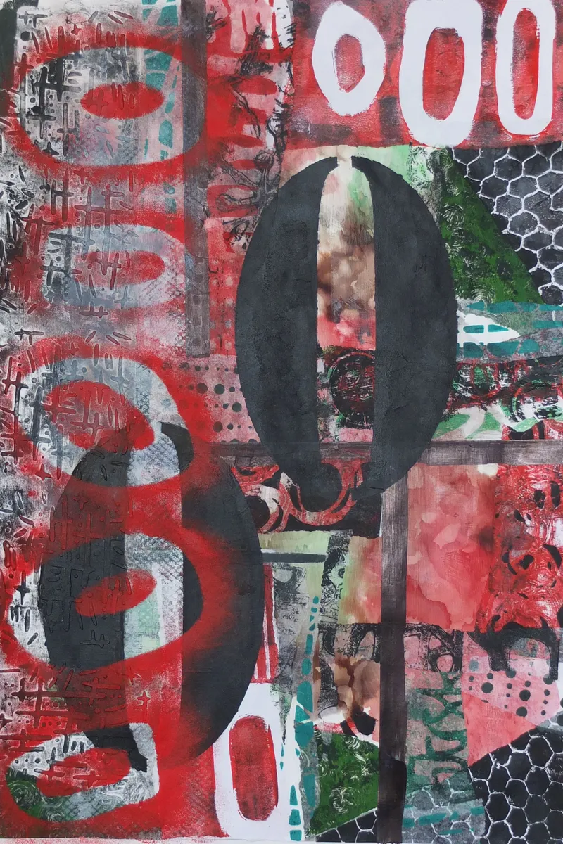 I explore the tension between technology and human connection in this Mixed Media work. Through layered textures, digital styled motifs, and bold contrasts of red, black, and green, this piece reflects a world where screens mediate emotion and devices interrupt intimacy. The repeated zeros—both open and closed—symbolise circuits, voids, and the endless loops of digital communication that often replace real interaction. Perfect for contemporary spaces, *Double Zero* invites reflection on how we connect, communicate, and coexist in a digital age.