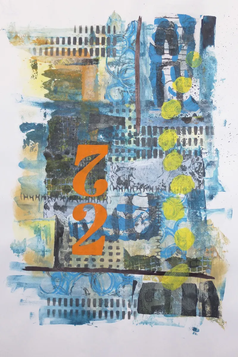 Immerse in the layered energy of Urban Rhythm No. 22, an original abstract artwork that captures the pulse of city life through bold textures, geometric patterns, and vibrant contrasts. This piece blends shades of blue, ochre, and charcoal with striking orange numerals and rhythmic yellow circles, evoking the structured chaos of an urban landscape. Each mark and layer tells a story of movement, architecture, and emotion—inviting the viewer to explore the interplay between order and spontaneity.