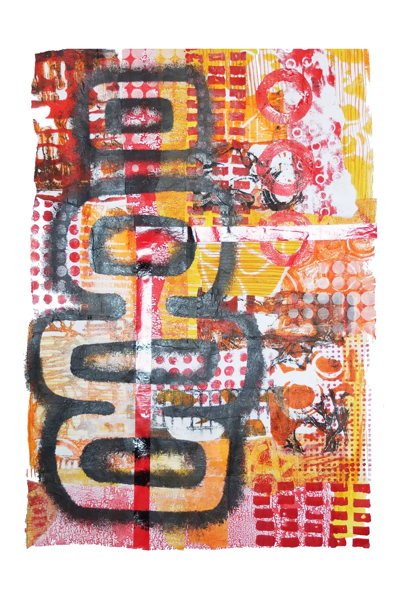 "Red Tape" captures the friction of modern life—the feeling of navigating systems and structures. The layers of halftone dots, grid patterns, and raw, distressed edges represent the complexity we move through every day, while the bold colours provide a sense of urgency and power.