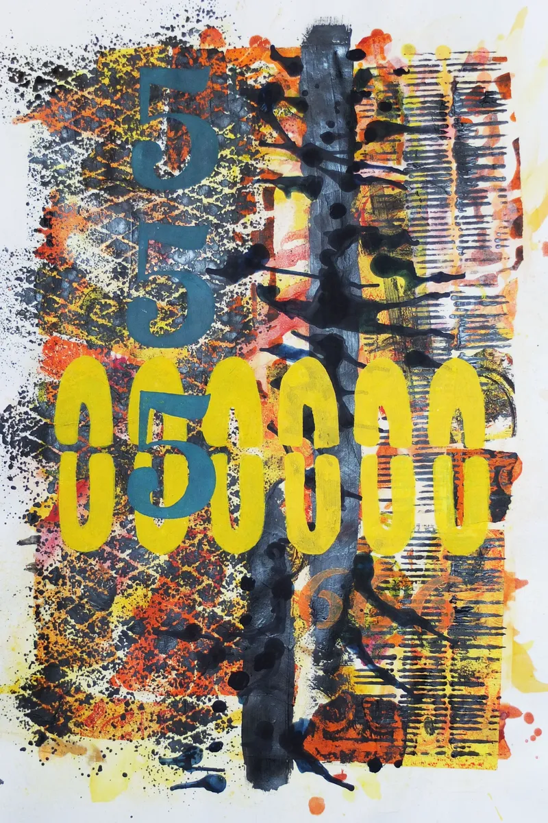 Experience the rhythmic energy of "Assembly Line." This original mixed media artwork is a high-octane exploration of repetition, structure, and urban movement. Featuring a series of vibrant yellow ovals that march across a dense, textured background, "Assembly Line" is anchored by repeating "5" motifs and a prominent vertical charcoal axis. It is a visual study of the beauty found in mechanical processes and the vibrant "noise" of modern production.